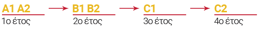 Στο φροντιστήριο μας προσαρμόζουμε αυτά τα 6 επίπεδα στις ανάγκες των ελλήνων σπουδαστών μας και διαμορφώνουμε το πρόγραμμα σπουδών σε 4 σχολικά έτη.